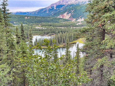 Back in the spring, we’d made a set of additional reservations at Denali National Park for August “just in case,” and decided to make a farewell visit to Denali, which is just a two-hour drive south from Fairbanks. We stayed at the Riley Creek Campground in the park, near the entrance. We arrived early enough to do a couple of day hikes our first day. The first was to Horseshoe Lake (named for its shape). We saw some impressive beaver dams and much evidence of their timbering prowess with trees up to foot in diameter being felled.