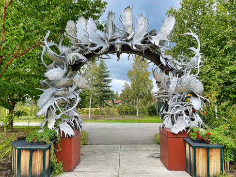 The next day we visited the Morris Thompson Cultural and Visitor Center, which had very interesting exhibits on the history and culture of “interior Alaska,” the area between the Alaska and Brooks Mountain ranges that includes Fairbanks. In addition to the exhibits, they also had a terrific antler arch outside.