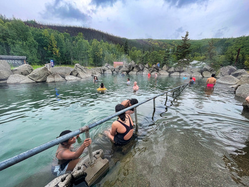 The hottest areas are where the springs bubble up at one end, and then cool as you move downstream. You just pick the area with the temperature that suits you, and settle in. Although the springs are all natural, BC Parks has lined the bottom with gravel so it’s comfortable to stand and move around. We thought these springs were much nicer than the Chena Hot Springs we’d visited a few days earlier.