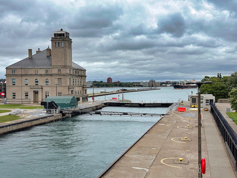 We crossed over into the US for the day to see the Soo Locks in action. The locks, built and operated by the U.S. Army Corps of Engineers (COE), can accommodate freighters up to 1,000 feet in length carrying ore, grain, and other materials throughout the Great Lakes and out to the Atlantic. Ships do not have to pay any fees to use the locks. There are currently a smaller and larger lock, and a new large lock is under construction with completion slated for 2030.