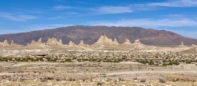 As noted above, we stayed overnight in Ridgecrest, CA, just north of the Mojave. We went there so we could visit the Trona Pinnacles, a set of gigantic tufa spires formed underwater 100,000 years ago in what is now a dry lakebed. Some of the spires are almost 150 fee high. Tufa is calcium carbonate that crystalizes around underwater springs. For those of you who are fans of HBO's Westworld, the Trona Pinnacles are the site of the portal to "The Valley Beyond" where the hosts hope to escape the theme park.
