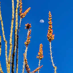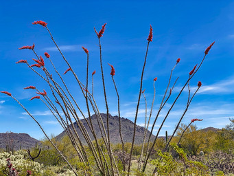 A unique desert plant is the ocotillo, which is mostly bare except for brilliant red flowers.