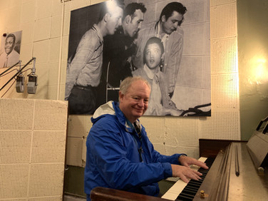 One day, we visited Sun Studios, where a young Elvis Presley recorded his first records. Sam Phillips, Sun's owner, also recorded such soon-to-be stars as B.B. King, Johnny Cash, Carl Perkins, and Jerry Lee Lewis. Although the studio is small, it's still in use in the evenings for recording - U2 used it recently. During our tour, Doug tried out the original mike (minus hip gyrations) used by Elvis and many others. We were even treated to a a very rare, recently re-discovered, recording featuring Elvis, Johnny Cash, Carl Perkins and Jerry Lee Lewis (the Million Dollar Quarter). The recording was made surreptitiously while the artists were just fooling around the studio. Doug even sat at the piano Elvis used during that session!
