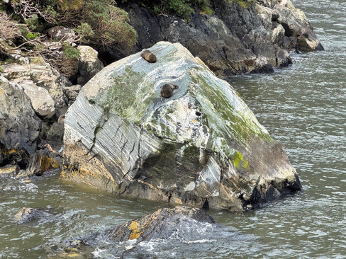 We sailed out to the fjord entrance, where the Tasman Sea lies between New Zealand and Australia, and then back into the Sound. On our return, we found some fur seals basking on a large boulder - they look like little fat sausages.