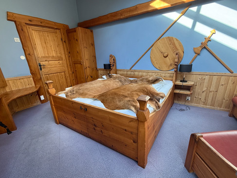 After a two-hour voyage, we arrived at the small town of Gudvangen, where we stayed the night in a small hotel where our room had a sod roof and Viking-themed decor. A reindeer skin covered the bed.