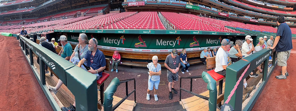 Then it was on to St. Louis for three full days. The first day we climbed onto our bus at 8 am (we were camped 30 miles west of downtown) and headed into the city. We took a tour of Busch Stadium, home of the St. Louis Cardinals, visiting some of the lounges and also the home team dugout. The stadium's architect also designed Camden Yards in Baltimore, and you can see some resemblances. We learned something of the skullduggery of baseball - for many years the visiting team's dugout only had one narrow wooden bench which was not protected from the sun or rain. The stadium is right downtown, and we could see the Gateway Arch peeking out from beyond the field.